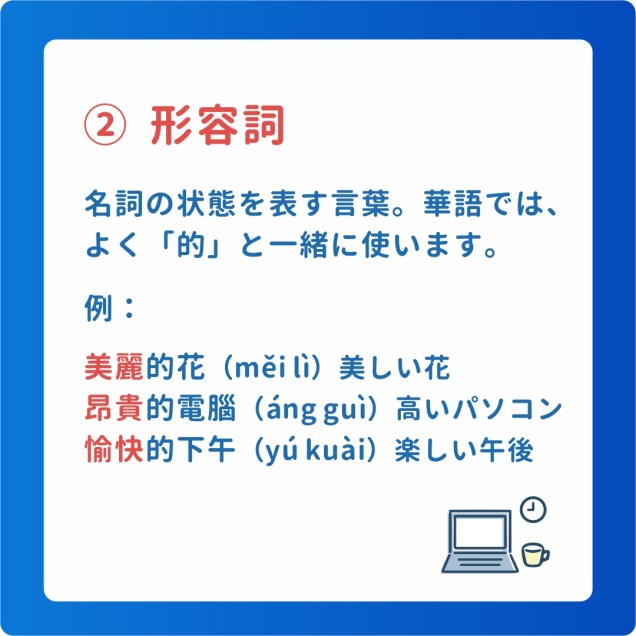 名詞の状態を表す言葉。華語では、形容詞はよく「的」と一緒に使います。